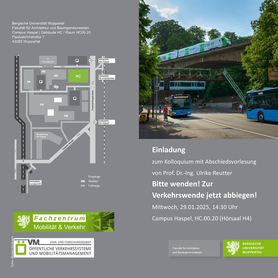 Nach 38 Berufsjahren, davon 10 an der Bergischen Universität Wuppertal, verabschiedet sich Prof. Dr.-Ing. Ulrike Reutter in den Ruhestand. Zu ihrer Abschiedsvorlesung und dem Kolloquium „Bitte wenden! Zur Verkehrswende jetzt abbiegen!“ sind Sie sehr herzlich eingeladen. Wir möchten mit Kolleginnen und Kollegen den Stand der Verkehrswende aus kommunaler Sicht, aus Sicht von Verkehrsunternehmen und aus Sicht der Wissenschaft diskutieren. Die Teilnahme ist kostenfrei.